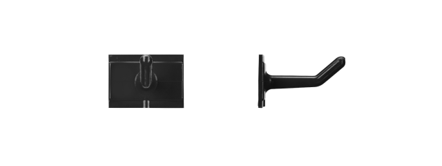 Die Schiene für das Ordnungssystem kann mit diesem Haken versehen werden, um sowohl Produkte mit Stielloch oder Handgriff als auch Eimer und Schaufeln aufzubewahren.